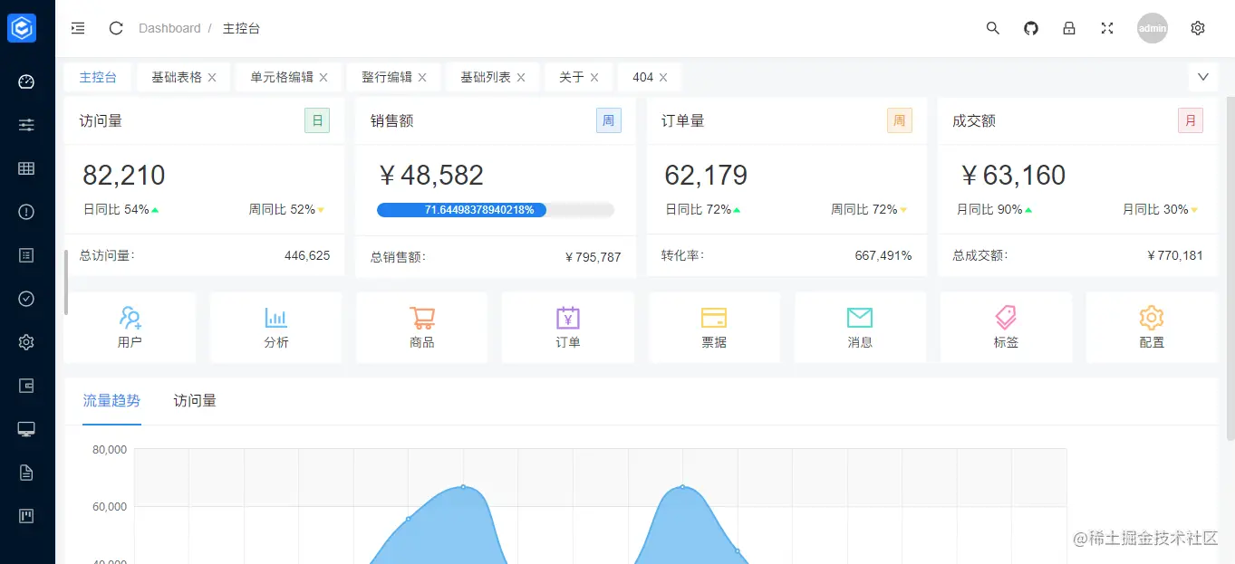 这是整个后台骨架核心入口模板,就是登录之后的页面,通常会包含,左侧菜单导航,顶部,内容区域,如下: