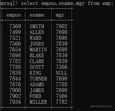 注意: 这个有13条数据,因为 KING 没有上级领导