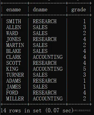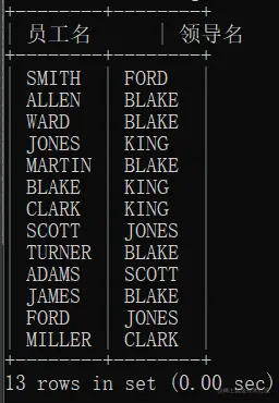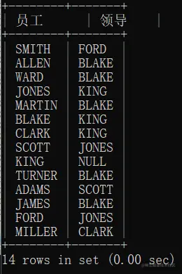注意 : 这个有14条数据,其中 KING 没有上级 ,会自动匹配NULL