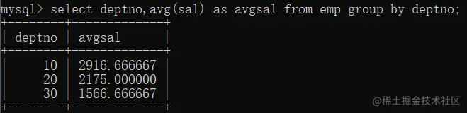 select deptno,avg(sal) as avgsal from emp group by deptno;