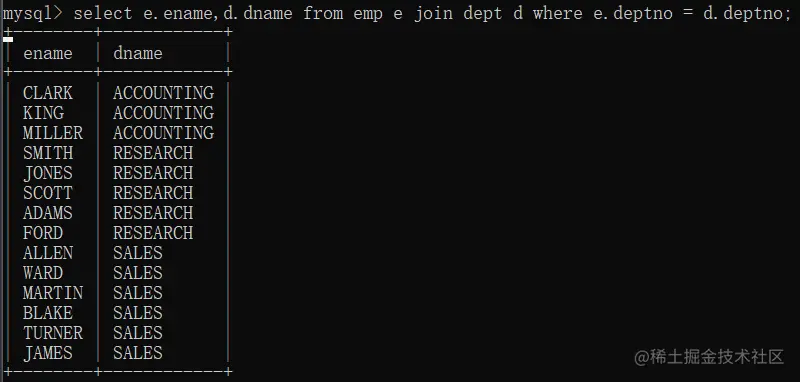 1.2查询每个员工的部门名称,要求显示员工名和部门名