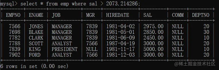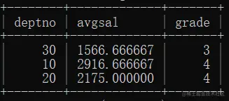 第二步 : 将上边的查询结果当作临时表 t,让 t 表和 salgrade表连接,条件是 :t.avgsal between s.losal and s.hisal;