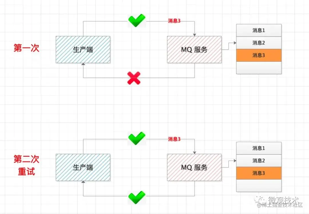 这里要特别注意一种特殊情况,如果MQ服务没有正常响应,不一定代表消息发送失败,也有可能是响应时正好赶上网络抖动,响应超时。