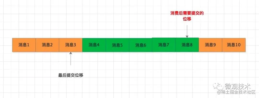 拉取了消息4~消息8,业务处理后,在提交消费位移时,不凑巧系统宕机了,最后的提交位移并没有保存到MQ 服务端,下次拉取消息时,依然是从消息4开始拉取,但是这部分消息已经处理过了,这样便会导致重复消费。