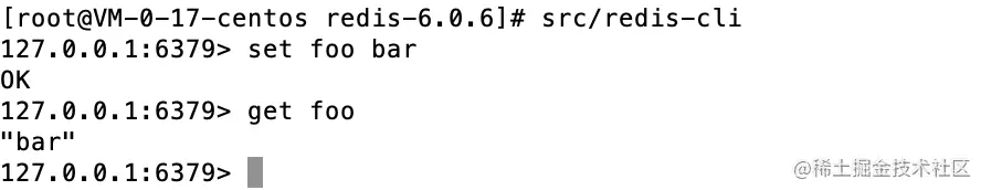 试用一下redis,通过本地cli工具连接redis服务器,给foo这个key设置值位“bar", 并验证