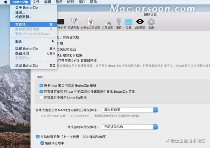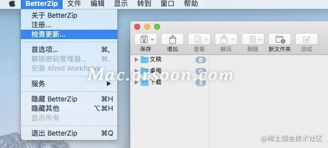 4、另外,我们在打开Better Zip时可以发现,菜单栏中有检查更新的选项。这个检查更新的选项就是我们上文中所提到的Better Zip手动更新。