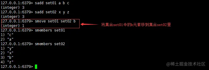 功能:将 member 元素从src集合移动到dest集合,member不存在,smove不执行操作,返回0,如果dest存在member,则仅从src中删除member。