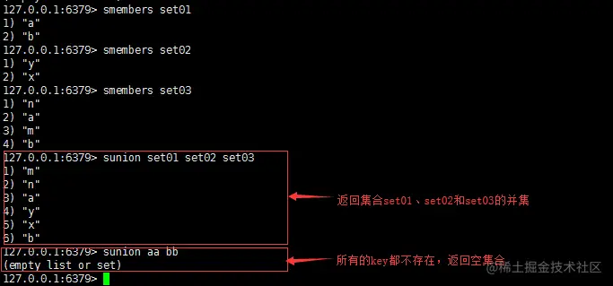 返回值:返回所有集合元素组成的大集合,如果所有key都不存在,返回空集合。