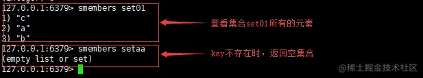 功能:获取集合 key 中的所有成员元素,不存在的key视为空集合。