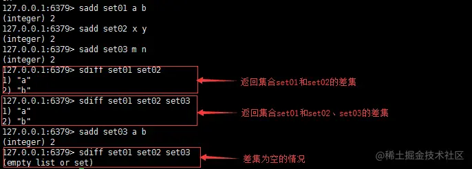 返回值:返回第一个集合中有而后边集合中都没有的元素组成的集合,如果第一个集合中的元素在后边集合中都有则返回空集合。