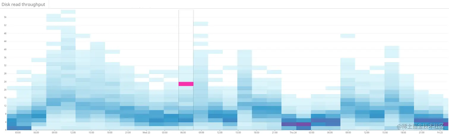 图4:热图显示了与图3相同时间段的磁盘读取吞吐量。磁盘读取也更均匀地分布在整个群集中。