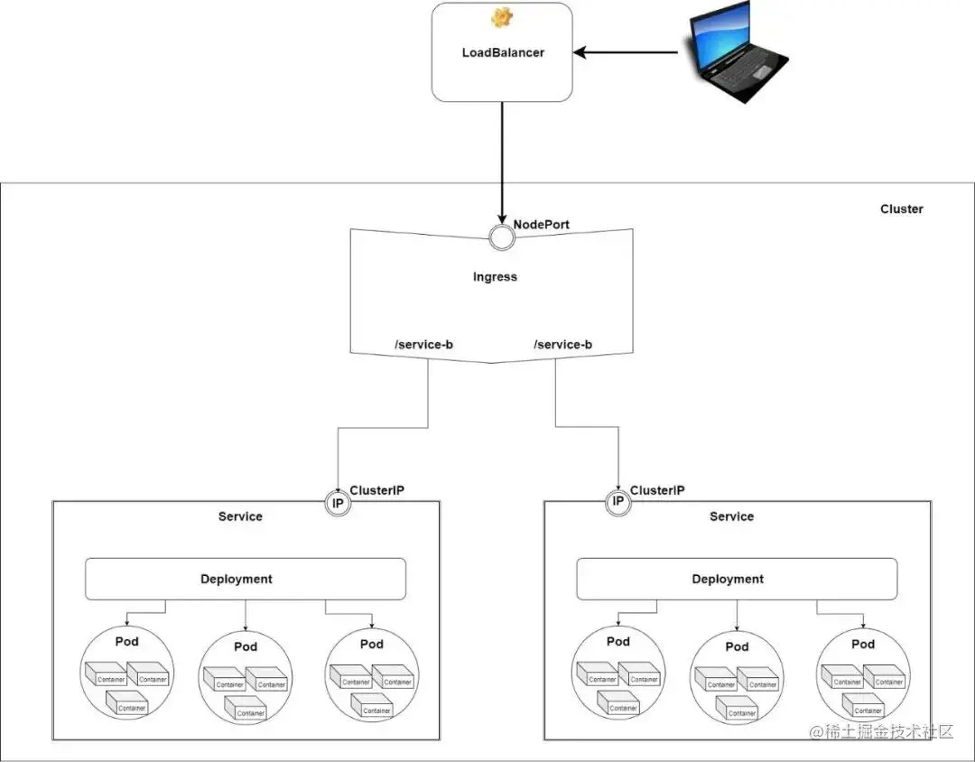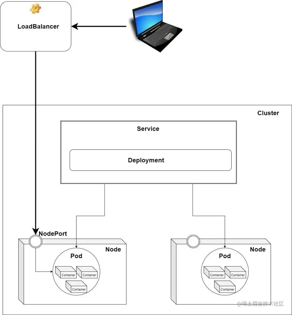正如我们在本文第一部分中所看到的那样,Pod正在节点上运行。节点可以是各种不同的设备,如笔记本电脑或虚拟机(但在云端运行时)。每个节点有一个固定的IP地址。通过将一个服务声明为NodePort,服务将会暴露节点IP地址,以便你可以从外部访问它。你可以在生产环境中使用NodePort,但对于拥有许多服务的大型应用程序来说,手动管理所有不同的IP地址十分麻烦。