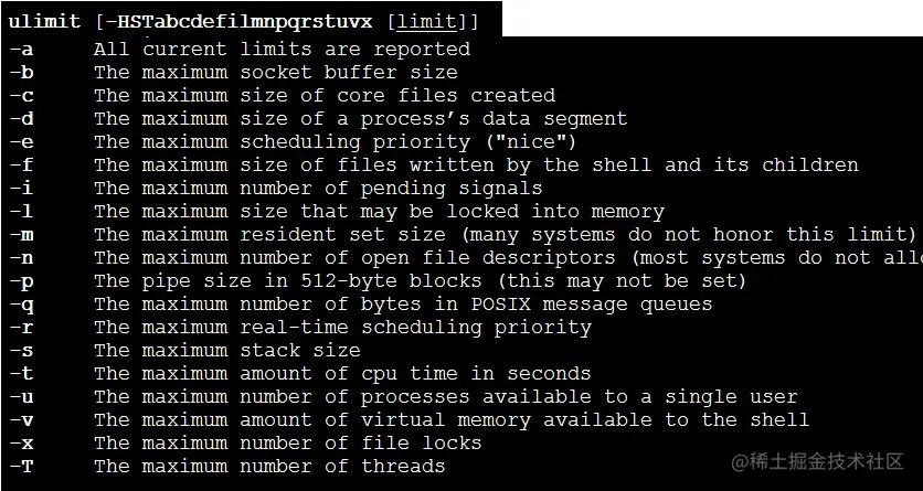 -H选项和**-S**选项分别表示对给定资源的硬限制(hard limit)和软限制(soft limit)进行设置。