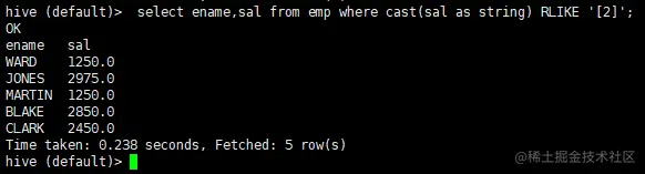 hive (default)> select * from emp where sal LIKE '2%';