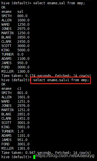 hive (default)> select sal +1 from emp;