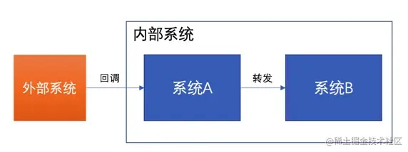数据来源于外部系统,外部系统通过回调把数据传输过来,内部系统通过系统A进行接受,接受完之后,转发给系统B