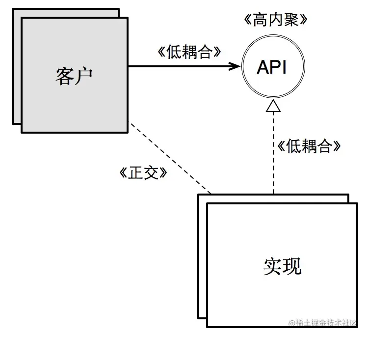 在之前《应对变化》中提到模块之间合的策略:缩小依赖范围,API是两个模块间唯一的联结点