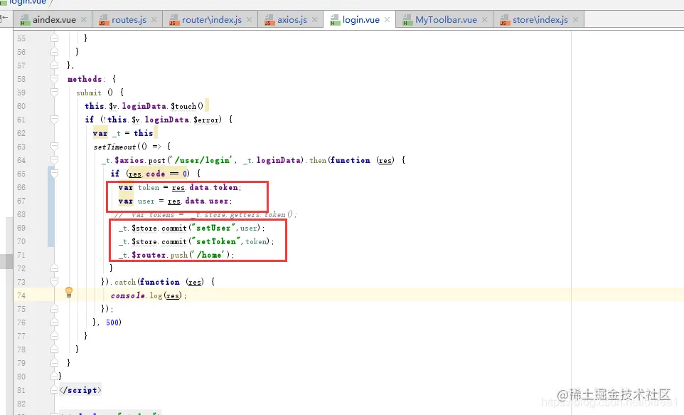 2.在login.vue 里登录成功返回user和token后将user和token保存至store中,如下使用commit方法