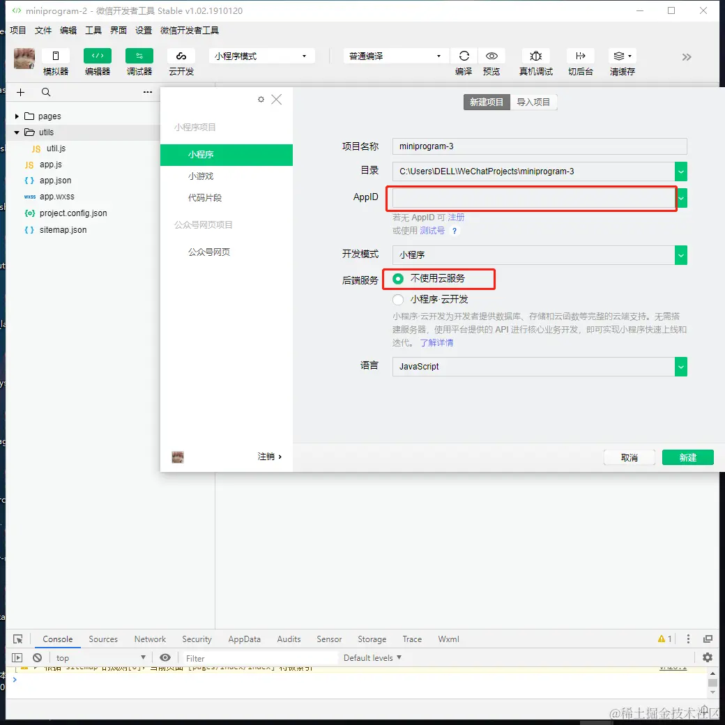 填入之前复制的appid,新手的话选择不使用云服务即可,这样目录相对简单一些