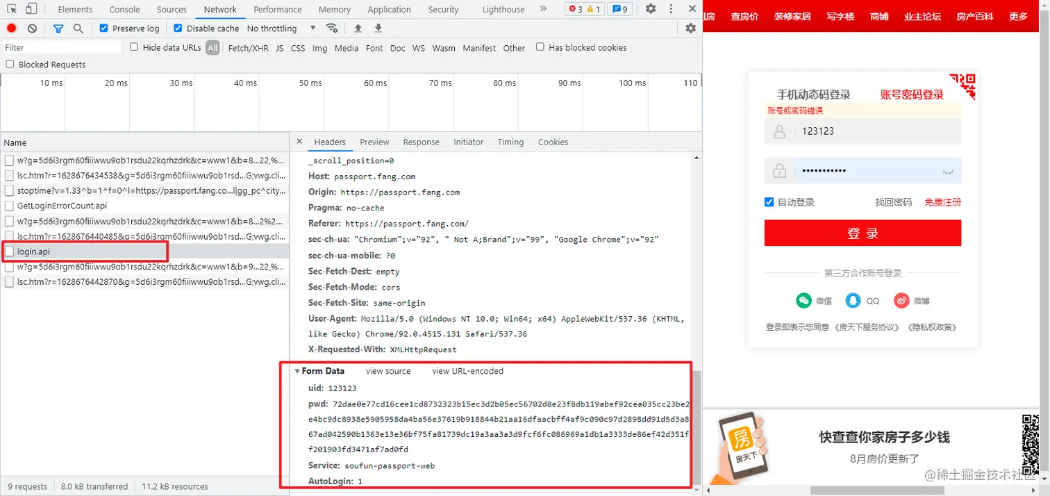 随便输入一个账号密码,点击登陆,抓包定位到登录接口为 passport.fang.com/login.api ,POST 请求,Form Data 里,密码 pwd 被加密处理了。