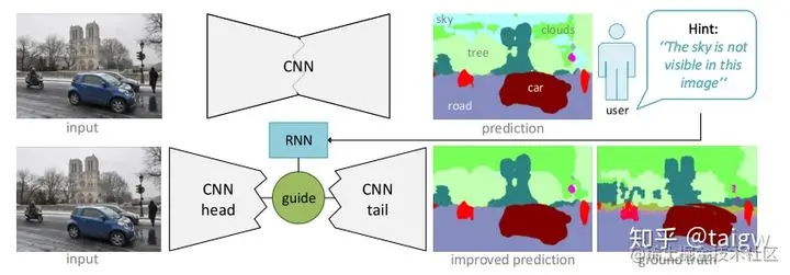 - 一个方法是,该分割系统主动问用户某一个区域是否为天空,用户说是或者不是。根据用户的回答把该区域设置为相应的类别,再通过反向传播,求得guide parameter的局部最优值。