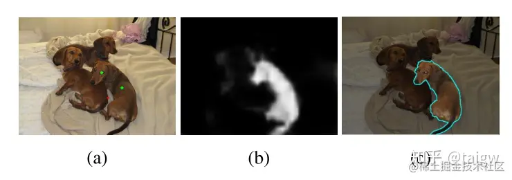 由FCN的输出可以得到一个概率图,在概率图的基础上再使用图割(graph cut)进行修正以使分割结果更靠近图像中的边缘。下图是一个分割的例子,其中(a)为输入图像和用户提供的前景点和背景点,(b)是由FCN得到的概率图,(c)是经过graph cut优化后的结果。
