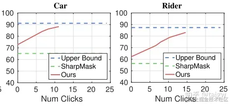 该文章在Pascal VOC 2012 数据集上,使用第一种交互,通过系统问用户20个问题,使分割mIOU从62.6%提高到了81.0%。第二种交互方式的实验中,使用的是COCO-stuff数据集,通过交互式修正,分割mIoU从30.5%提高到了36.5%,而DeepLab在该数据集上取得的mIoU为30.8%。