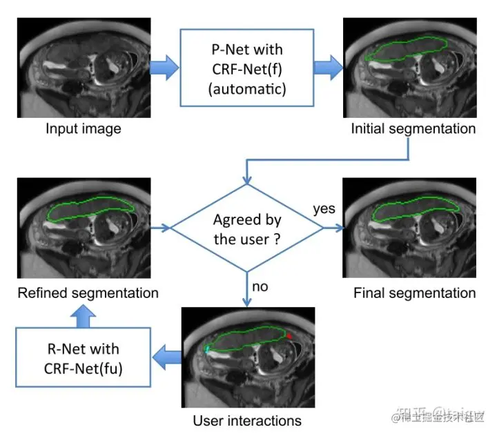 DeepIGeoS是发表在TPAMI上的一篇文章,与Deep Interactive Object Selection需要用户一开始就要提供交互点不同的是,DeepIGeoS让用户只需在一个自动分割结果的错误分割区域提供交互,因此可以更加省时和高效。