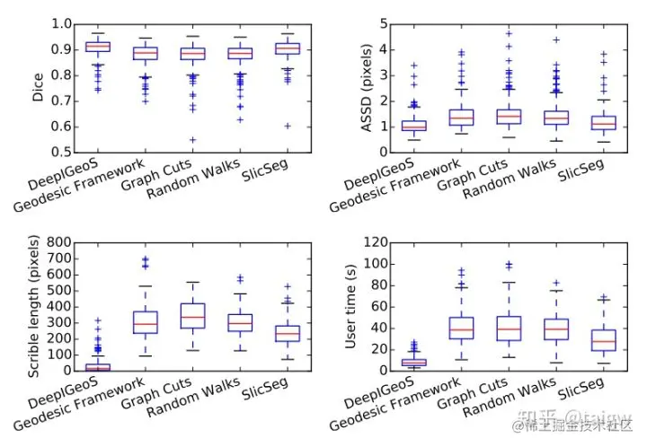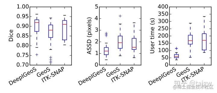 该文章分别在二维胎儿MRI图像和三维脑肿瘤图像上做了实验,结果表明与传统的交互式分割方法例如Graph Cuts, Random Walks, ITK-Snap相比, DeepIGeoS大大降低了对用户交互的需求,并且减少了用户时间,在二维胎盘图像和三维脑肿瘤图像的交互式分割中需要的用户时间分别为约8秒和60秒。