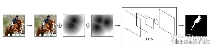 工作流程:如下图所示,用户画几个点,绿色的点为前景(目标对象),红色的点为背景(背景),这些点转化为基于前景点的距离图像和基于背景点的距离图像。原图为RGB三个通道的图像,加上这两个距离图像后一共五个通道,将这五个通道的图像作为一个pair(图像, 用户交互),作为全卷积网络(FCN)的输入以得到分割结果。因此在分割过程中,用户只需给几个点就能指导FCN的分割。