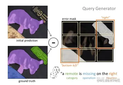 模拟用户输入的过程如上图所示,将一个初始分割结果与标准比较,可以发现分割错误的区域,再根据这些错误的分割部位生成文字信息作为模拟的用户输入。