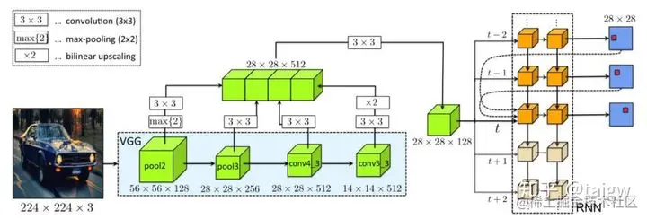 这些顶点是按照一定顺序预测的,比如顺时针的顺序。假设有T个顶点,先使用一个CNN预测第一个顶点,之后的第t个顶点通过RNN结合第一个顶点和第t-1及第t-2个顶点还有image crop预测的, RNN模型如下图所示(以VGG网络作为特征提取网络):