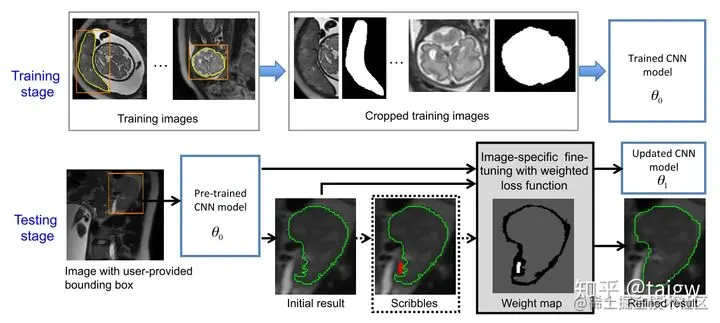 微调过程在更新CNN参数时,使用了一个加权的损失函数,忽略了那些倾向于分割不准确的像素,仅使用具有高度可靠性的用户标注的像素来优化CNN。