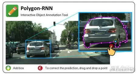 PolygonRNN是针对二维图像中物体边缘的标注而提出的方法,其流程如下图所示,用户提供一个感兴趣的物体的边界框,该方法通过RNN来预测这个边界框中物体边缘上的一系列顶点,这些顶点所组成的多边形区域作为物体的分割结果。