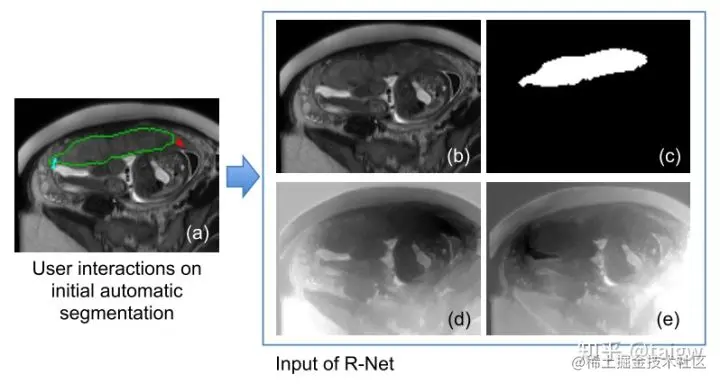 如下图所示,(a)中绿色曲线为初始分割结果,红点为用户对其修正时标记的前景点,青色为用户标记的背景点,(d)和(e)分别是这两种交互所对应的测地线距离图像。使用测地线距离比欧式距离可以更好地反映图像中的边缘和上下文信息。原始图像,初始分割结果,前景交互点的距离图像、背景交互点的距离图像组合在一起,得到一个四个通道的图像,以作为第二个CNN(R-Net)的输入。