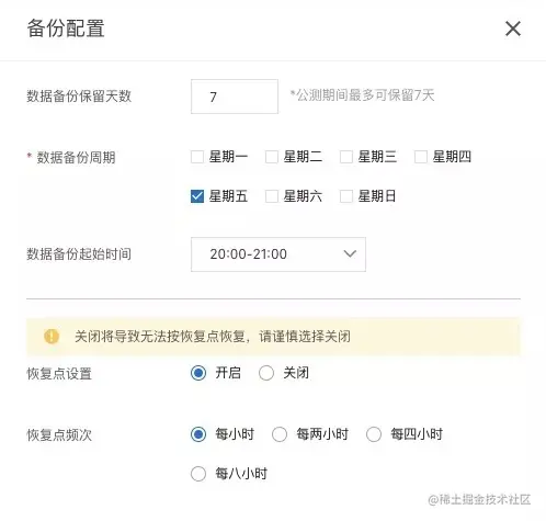 备份策略是指实例进行备份的周期与时间段,创建一致性恢复点的频率,以及数据备份的保留天数等等。