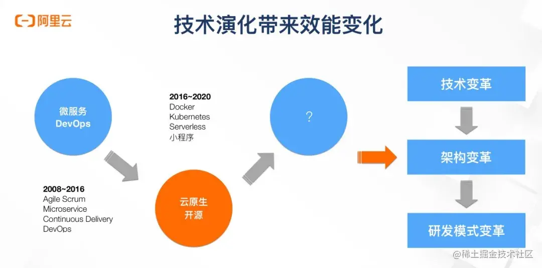说完了协作问题,再来看技术的演化是如何影响研发效能的。先粗略的看看过去几年的几个技术变化。在2008年开始业界提出了微服务、持续交付、DevOps等等一系列的概念,延续至今。与此同时阿里巴巴也对电商核心系统进行了服务化改造,后来又发现服务多了,管理出现了难题,只有DevOps可以消除瓶颈,释放生产力。这几件事其实内部是有一定逻辑的,也就是业务驱动技术变革,技术促进架构变革,架构又推动研发模式变革。