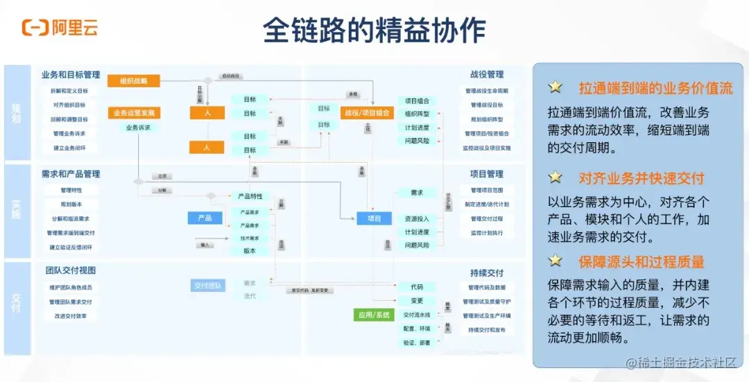 所以笔者认为效能提升首先要做到的就是端到端可见的业务价值。从业务团队到产研团队有以下几个实施路径。首先是建立以业务价值流为视角的协作链路。以往多半是通过项目管理软件解决产研团队的协作问题,以一个产品或者团队为单位组织需求、缺陷、任务等等。在新的体系中需要将业务团队也纳入其中,并且拉通业务价值与产品研发需求、任务之间的关系,从而实现端到端透明可视。