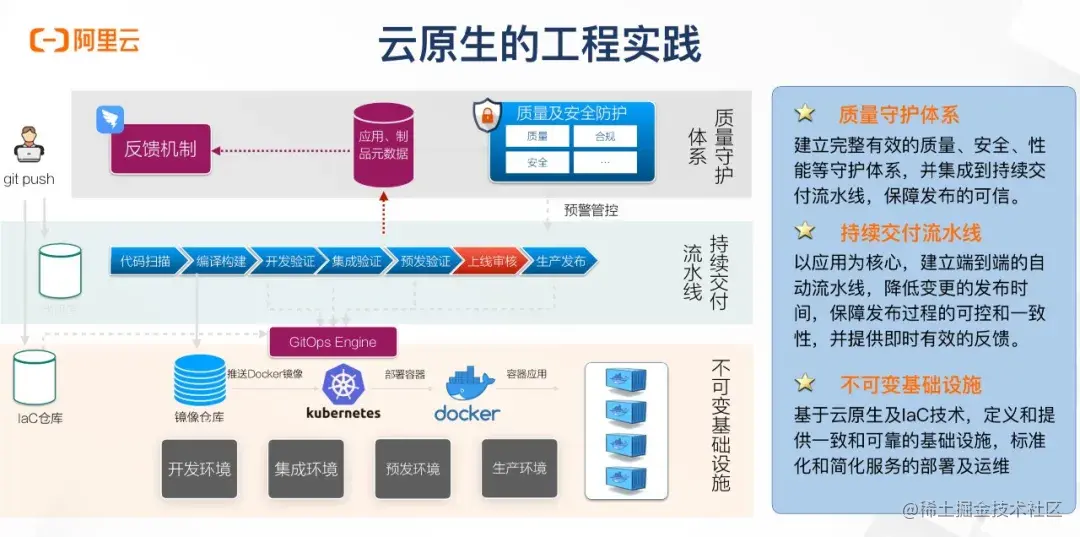 最后是云原生工程实践。这张图把工程实践分为了三个部分,最底层是不可变基础设施,中间是持续交付流水线,最上层是质量守护体系。