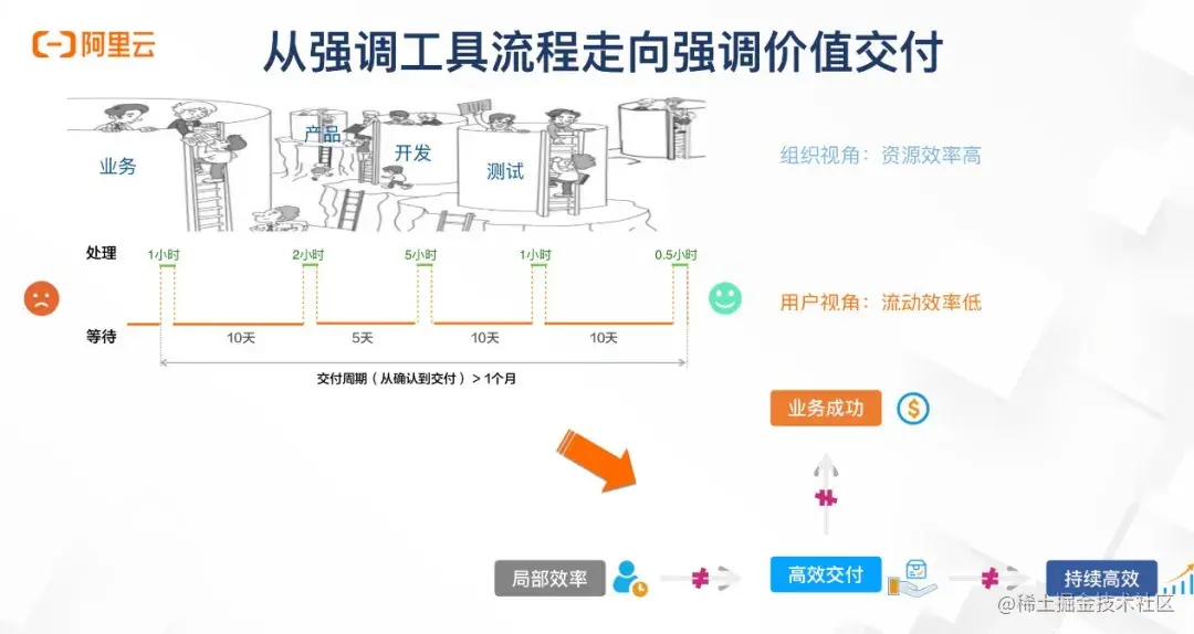 因此可以得出这样一个结论就是局部效率,并不代表可以高效的交付业务需求。局部效率有很多工具和手段去提升,这是一个相对收敛的问题,甚至可以通过加班去弥补效率的不足,但是高效的交付用户能够感知到的业务价值并不容易做到,上面这张图就说明了这一点。同样也并不代表可以持续的高效交付,因为从本源上没有办法保障永远用全局最优的组织和架构以及流程去对应,甚至没有机制去发现瓶颈问题。当然也并没有办法去回答业务成功问题,因为业务团队与产研团队距离过远,这种部门墙阻断了产研去思考和理解业务成功与自己产出的关系。