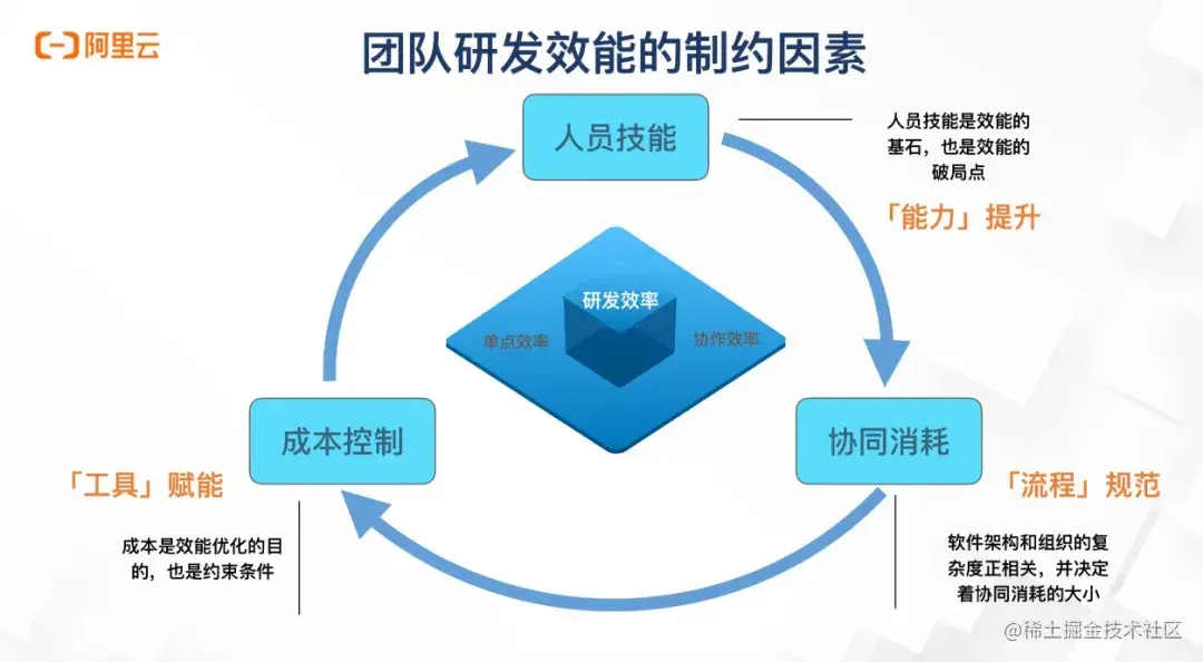 结合上面从人员、架构、技术三方面的分析,在进一步提取中间的关键因素,会形成这样的一个环。这三个关键因素就是成本、人、和人与人之间的协同损耗。成本是不可能无限放大的,所以是这个环里面的最关键约束。另外因为人的能力参差不齐,那么就无法创造出完美的架构和完美的组织设置,这里面就会出现大量的协同消耗。刚才也提到了,技术债务是会累积的,协同消耗往往会随着时间不断放大,消耗更多的人力,在固定的成本约束下会导致更少的业务人力投入。这个环就会出现负反馈,也就是越来越差。所以才有了探讨研发效能这个问题的必要性。