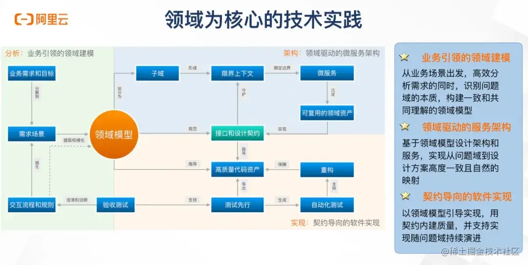 再来看领域为核心的技术实践。这里分为三个部分,分析、架构以及对应的实现。分别为业务引领的领域建模、领域驱动的微服务架构、以及契约导向的软件实现。