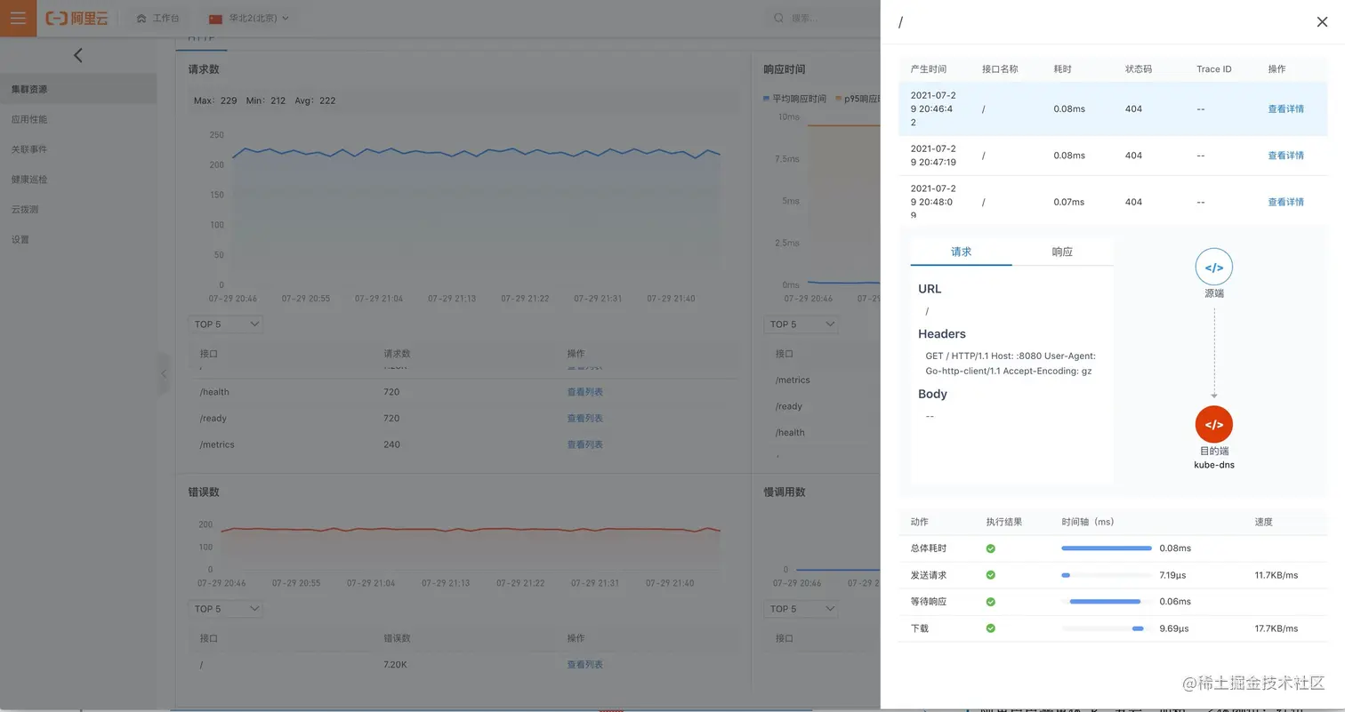 - 使用 Kubernetes 监测定位服务与工作负载响应慢根因,Kubernetes 监测通过抓取网络链路关键路径的指标,查看 DNS 解析性能,TCP 重传率,网络包 rtt 等指标。利用网络链路关键路径的指标定位响应慢的原因,进而优化相关服务。