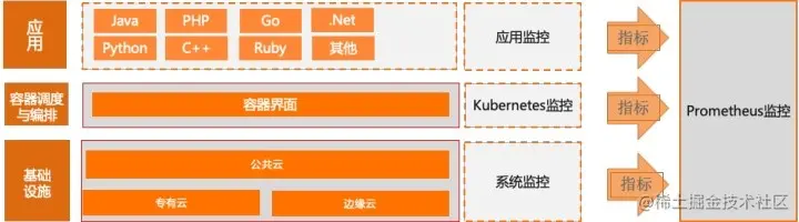 - 构建完整监测体系:与应用实时监测服务的其他子产品,共同构建完整监测体系。应用监测关注应用语言运行时、应用框架与业务代码;Kubernetes 监测关注容器化应用的容器运行时、容器管控层与系统调用,两个监测均服务于应用,关注应用的不同层次,两个产品互为补充。Prometheus 是指标采集,存储,查询的基础设施,应用监测与 Kubernetes 监测的指标类数据均依赖 Prometheus。