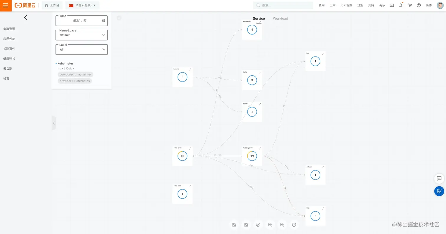- 使用 Kubernetes 监测探索应用架构,发现预期外的网络流量。Kubernetes 监测支持查看全局流量构建起来的拓扑大图,支持配置静态端口标识特定服务。利用拓扑图直观强大的交互进行应用架构探索,验证流量是否符合预期,架构形态是否合理。