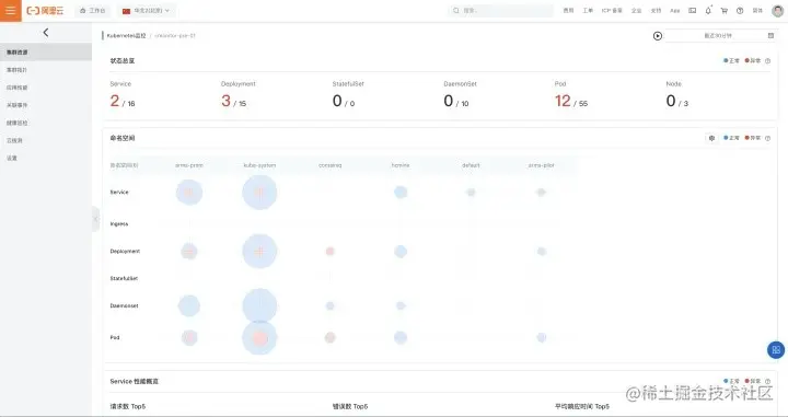 - 通过 Kubernetes 监测的系统默认或者自定义巡检规则,发现节点,服务与工作负载的异常。Kubernetes 监测从性能、资源、管控三个维度对节点、服务与工作负载进行异常巡检,将分析结果直观地通过正常、警告、严重等状态配合特定颜色进行展示,帮助运维人员直观感知用户节点,服务与工作负载运行状态。