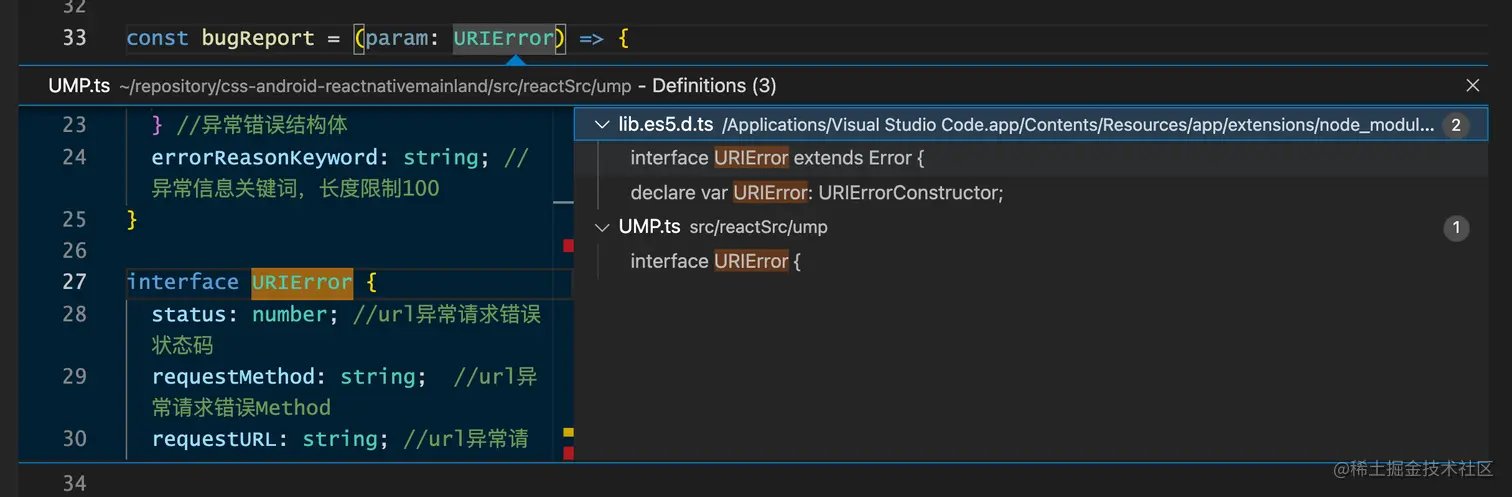 如上图,当我在调用bugReport传入URIError的对象时,vscode提示了如下错误