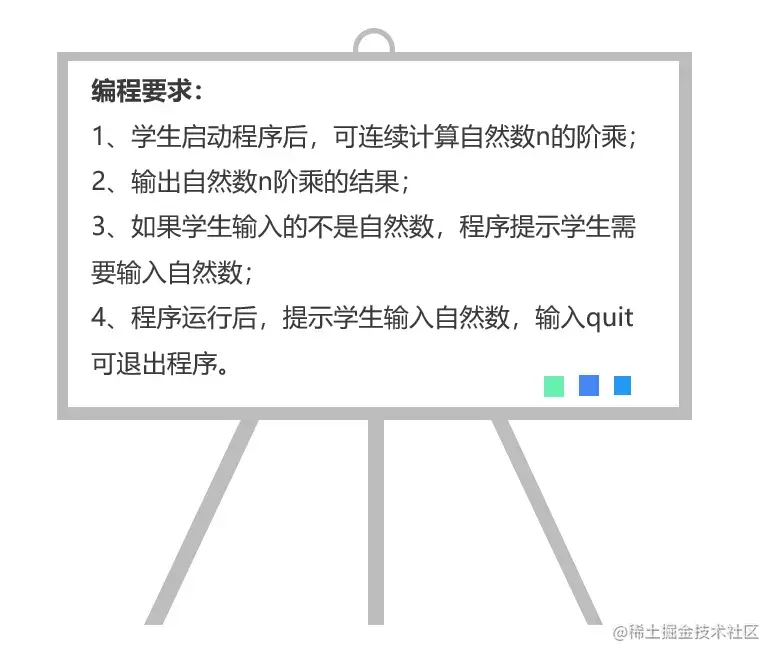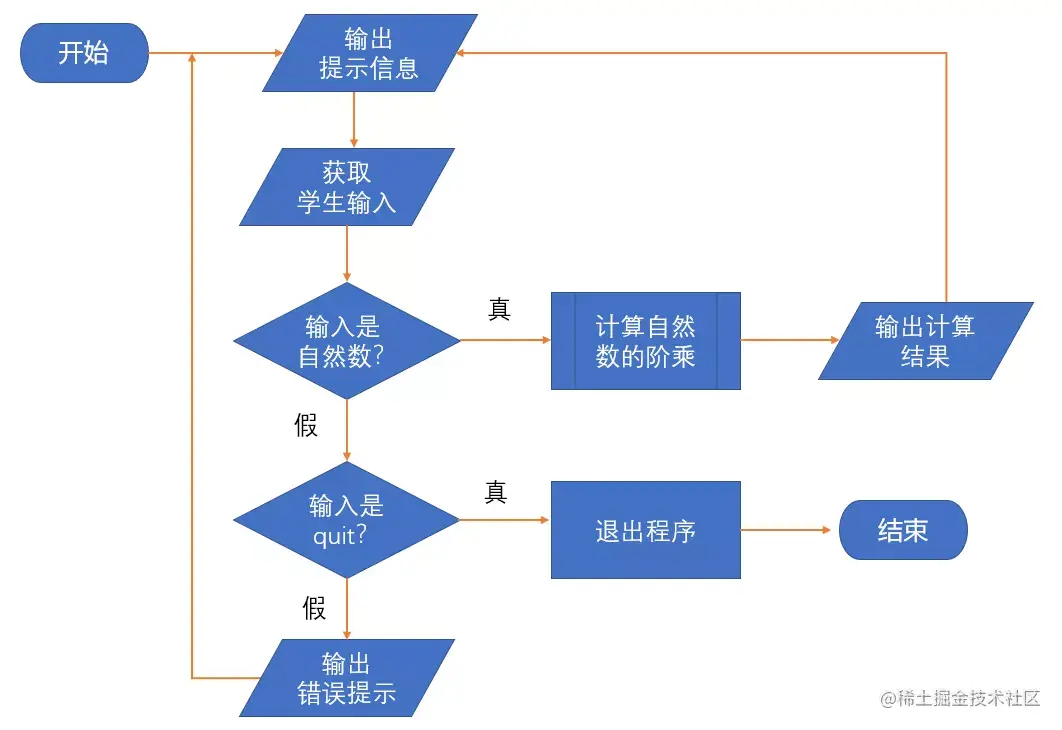 准备使用while循环来保持程序的运行状态,循环条件为True,循环体为计算自然数阶乘的代码,在循环体中需要判断学生输入的是否是quit,如果是quit,调用break语句退出循环,程序结束。
