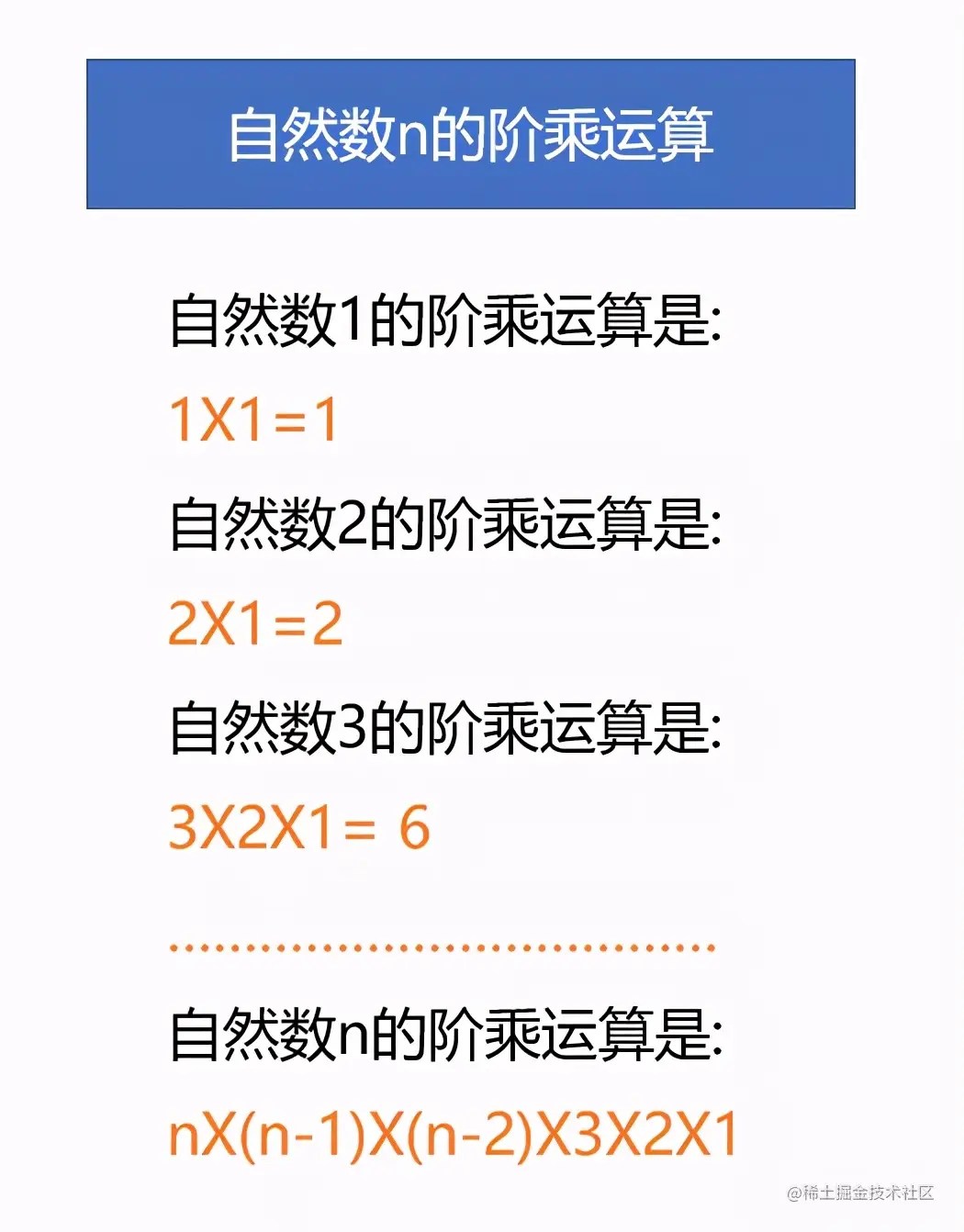 最后一个要解决的问题就是如何计算自然数n的阶乘。要用程序计算自然数n的阶乘,首先要了解自然数n阶乘的计算过程,然后再把计算过程用程序来实现。