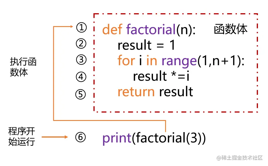 当代码包含定义的函数时,Python解释器不会自动执行函数代码,只有代码中的语句调用函数时,Python才会执行函数代码。因此上面的程序运行后,会先执行第6条语句,第6条语句调用了factorial函数,Python解释器再执行factorial函数代码。